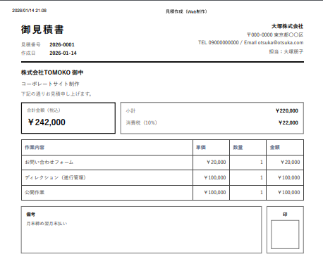 見積名・顧客名・作成日といった基本情報に加え、作業内容・単価・数量を入力することで金額が自動計算され、小計・消費税(10%)・合計金額をリアルタイムで確認できます。